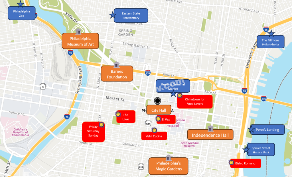 Penn’s Landing: A lively waterfront hub with concerts, festivals, and outdoor movie screenings, providing year-round entertainment. Along with